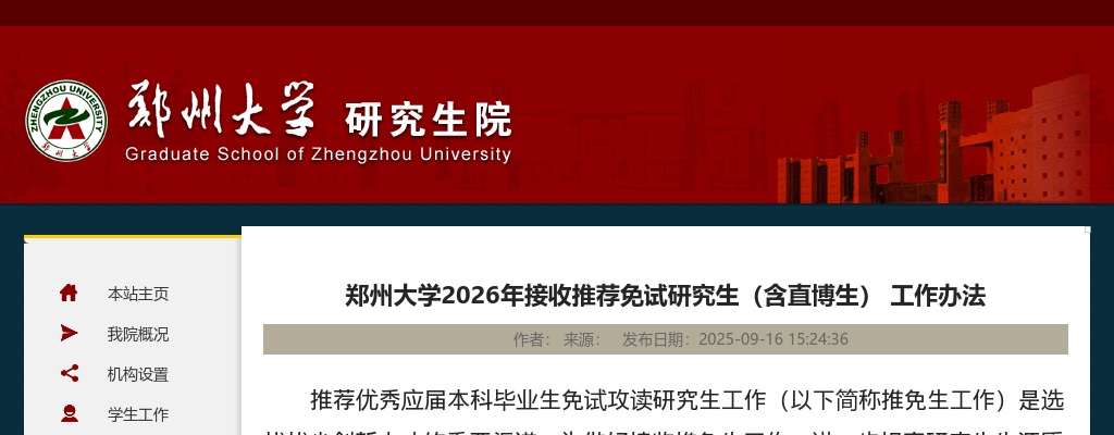 原标题:郑州大学2026年接收推荐免试研究生(含直博生) 工作办法